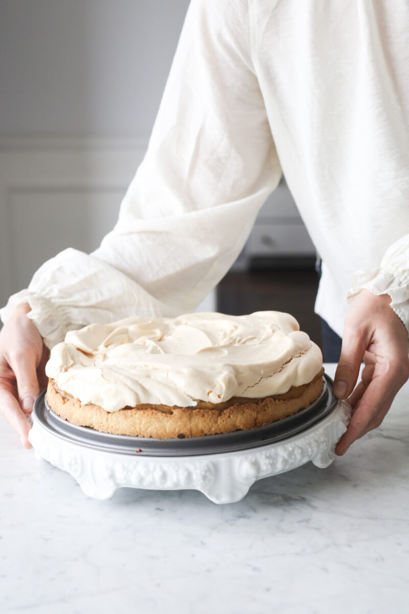 - Na podpieczony spód wykładamy mus jabłkowy, a na wierzch rozkładamy bezę. Ciasto umieszczamy w piekarniku rozgrzanym do 180º C i natychmiast obniżamy temperaturę do 140º C (opcja: termoobieg). Pieczemy przez 1 godzinę do momentu, aż wierzch bezy będzie chrupiący. Studzimy ciasto przy otwartych drzwiczkach piekarnika.