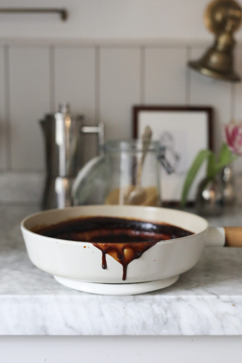- Aby przygotować słony karmel: na patelni rozpuszczamy brązowy cukier (nie mieszamy!), a gdy się rozpłynie ostrożnie dolewamy mleko kokosowe. Wstrząsamy patelnią do połączenia się konsystencji i posypujemy płatkami soli. Karmel przelewamy do dzbanuszka.