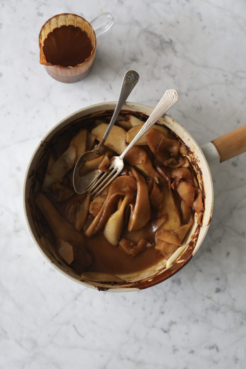 - Aby przygotować karmelizowane gruszki: na tej samej patelni (po karmelu) rozkładamy plastry gruszek. Delikatnie podsmażamy, aż gruszki staną się kruche i całkowicie brązowe.