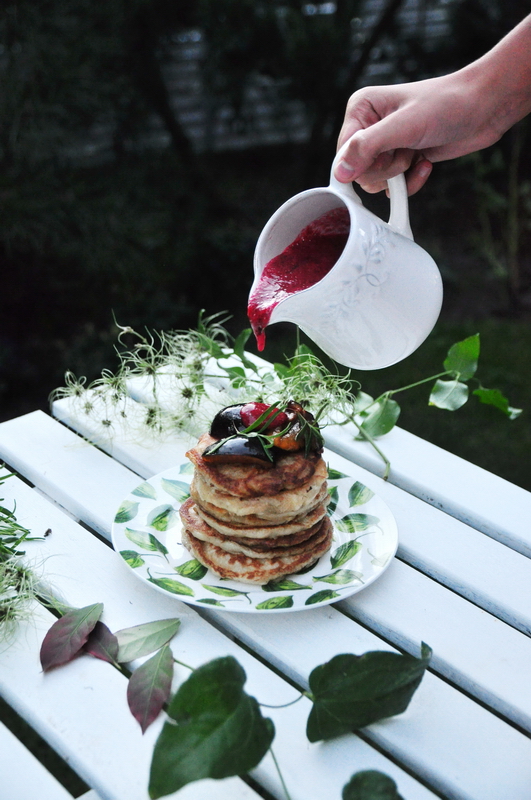 3. Do wyrośniętego ciasta dodajemy nasączone rodzynki i mieszamy. Na rozgrzaną patelnię z masłem nalewamy odrobinę ciasta i smażymy placuszki (ok.1 minuta z każdej strony). Gorące placuszki podajemy z sosem ze śliwek i świeżymi listkami rozmarynu.