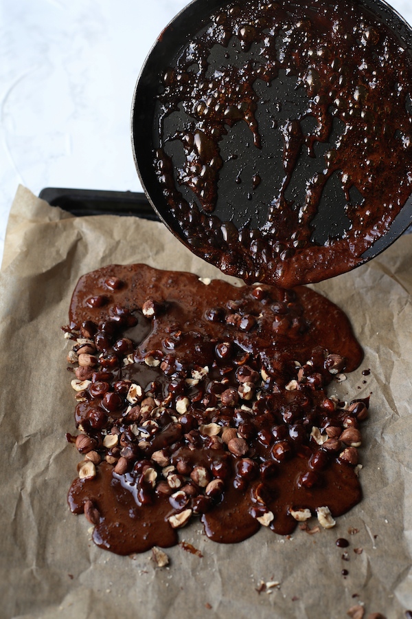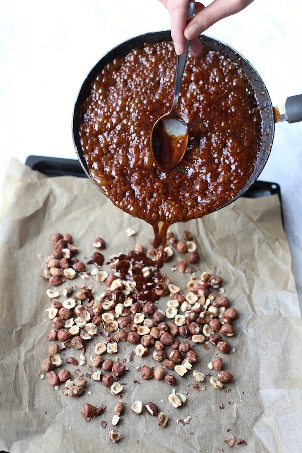 2. Aby przygotować karmel: na małej patelni rozpuszczamy brązowy cukier, a gdy stanie się płynny dodajemy śmietankę. Następnie całość ostrożnie przelewamy na uprażone orzechy laskowe (patrz na zdjęciu). Pozostawiamy do ostygnięcia. Przed podaniem możemy pokruszyć. Smakują najlepiej następnego dnia (nie są już takie twarde).