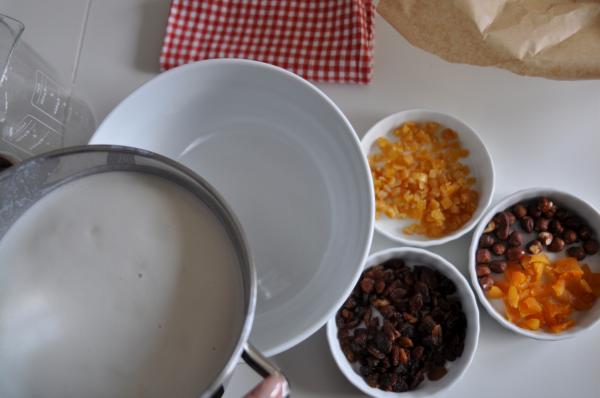 1. Do średniej wielkości garnka przelewamy maślankę z cukrem i gotujemy na małym ogniu. Gdy masa lekko zgęstnieje, odstawiamy z ognia i dodajemy masło. Mieszamy. Następnie dodajemy do masy nasze przyprawy (gałkę muszkatołową, cynamon, goździki) oraz żółtka, przesianą mąkę i wyrabiamy ciasto. Sodę rozpuszczamy w kropli wody i dodajemy do ciasta. Na końcu dodajemy wszystke bakalie (migdały, orzechy laskowe, skórkę pomarańczową, rodzynki). Ubijamy białka i ostrożnie łączymy z ciastem.