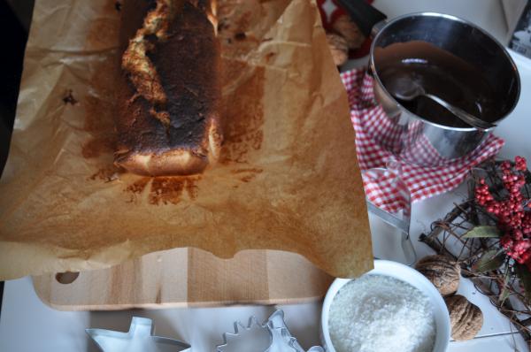 2. Tak przygotowane ciasto przelewamy do keksówki wyłożonej papierem do pieczenia. Pieczemy w rozgrzanym piekarniku do 200 stopni C, ok. 60 minut. Gdy ciasto całkowicie wystygnie, możemy polać polewą czekoladową i za pomocą szablonu z kartonu udekorować nasz piernik gwiazdami z mieszanki wiórek kokosowych z cukrem pudrem:-)