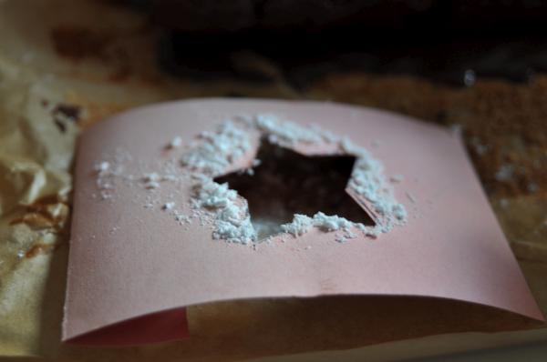 Gdy ciasto całkowicie wystygnie, możemy polać polewą czekoladową i za pomocą szablonu z kartonu udekorować nasz piernik gwiazdami z mieszanki wiórek kokosowych z cukrem pudrem.