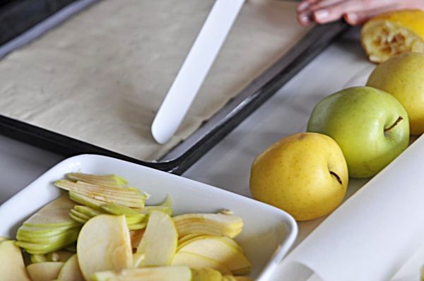 1. Piekarnik rozgrzewamy do 220 stopni C. Jabłka dokładnie myjemy, kroimy na połówki, a następnie w plasterki. Umieszczamy je w naczyniu i skrapiamy sokiem z cytryny.