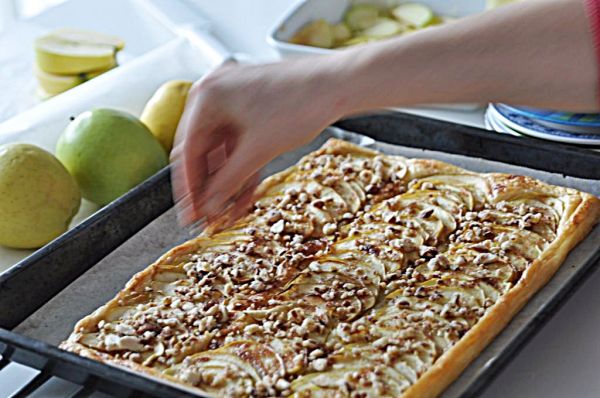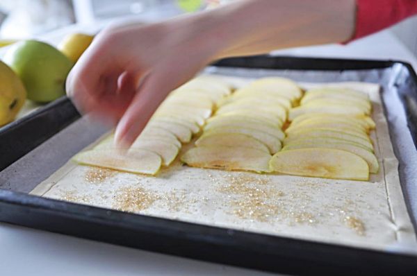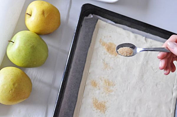 2. Rozwałkowane ciasto wykładamy na blasze z rozwiniętym papierem do pieczenia i posypujemy delikatnie wierzch brązowym cukrem. Plasterki jabłek układamy na cieście, tak aby na siebie zachodziły. W małym garnku, podgrzewamy masło z cukrem brązowym i cynamonem. Płynną mieszankę delikatnie przelewamy na ułożone jabłka. Pieczemy ok. 20 minut, a w między czasie na rozgrzanej patelni z masłem, prażymy kawałki rozdrobnionych migdałów (max. 1,5 minuty). Odstawiamy patelnię z ognia i posypujemy migdały cukrem pudrem.