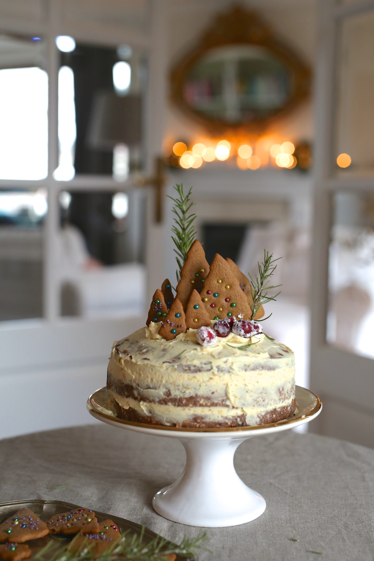 - Upieczone ciasto kroimy na 3 płaty (opcjonalnie: płaty możemy skropić likierem lub rumem). Ciasto przekładamy schłodzonym kremem. Dekorujemy piernikami, schłodzonymi kulkami żurawinowymi i zielonymi gałązkami. Ciasto najlepiej smakuje gdy jest schłodzone.