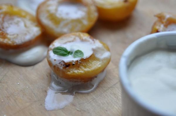 2.Morele wyjmujemy z piekarnika. Podajemy z masą mascarpone i świeżymi listkami mięty.
