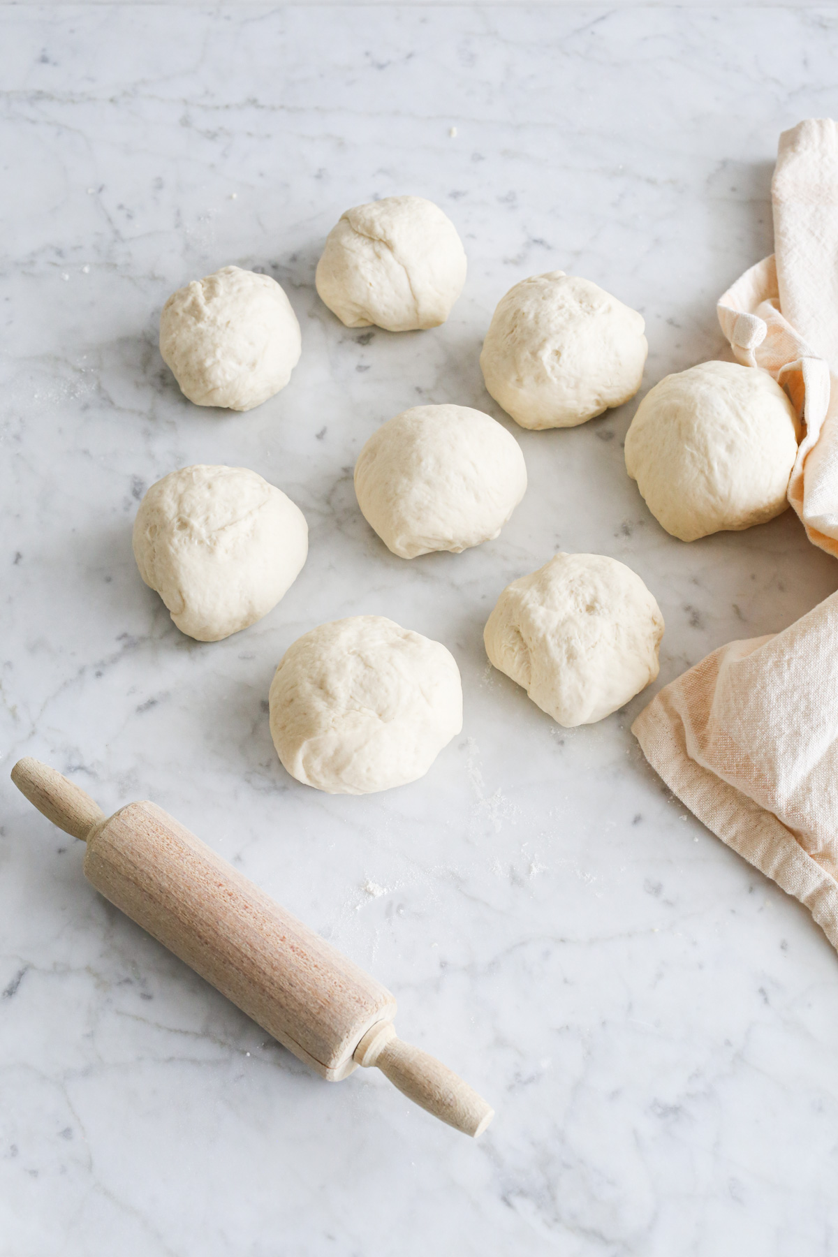 - Świeże drożdże mieszamy z ciepłą wodą i odstawiamy na 10 minut. Mąkę przesiewamy ze szczyptą soli, dodajemy drożdże i wyrabiamy ciasto. Formujemy kule. Przekładamy do miski wysmarowanej oliwą, przykrywamy folią spożywczą i odstawiamy w ciepłe miejsce na minimum 30 minut, by podwoiło swoją objętość.