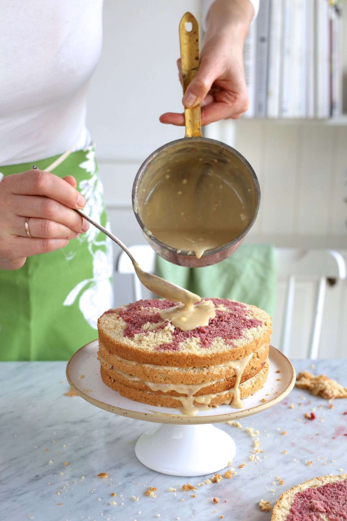 - Aby przygotować krem: śmietankę przelewamy do garnuszka, dodajemy chałwę i podgrzewamy na małym ogniu, stale mieszając, aż chałwa się rozpuści. Odstawiamy do ostygnięcia, a następnie dodajemy 2-3 łyżki serka mascarpone i mieszamy, do uzyskania jednolitej masy. Resztę serka mascarpone delikatnie ubijamy i odstawiamy – będzie nam potrzebna do dekoracji tortu.