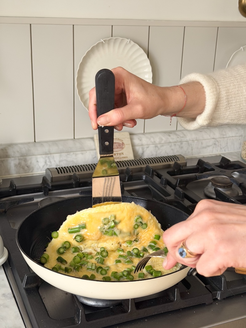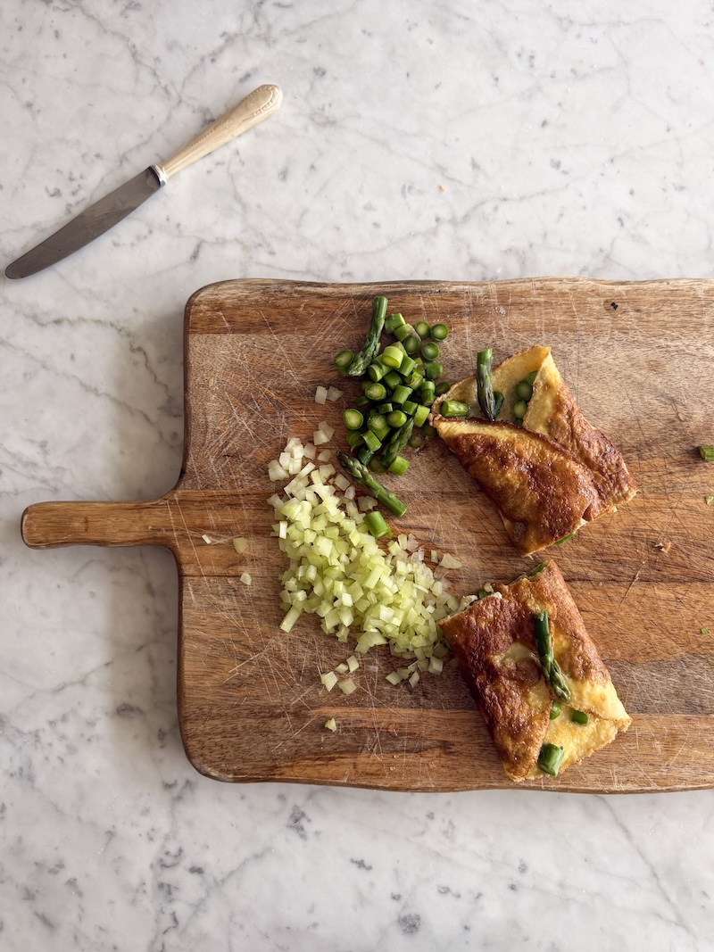 2. Szparagi sparzamy wrzątkiem przez około 1–2 minuty, potem zalewamy lodowatą wodą i kroimy je na mniejsze kawałki. W miseczce rozbijamy jajka i lekko je roztrzepujemy. Na patelni rozgrzewamy masło, wlewamy jajka i dodajemy szparagi oraz starty parmezan. Smażymy do momentu, aż masa się zetnie, po czym zawijamy całość w formę omletu.