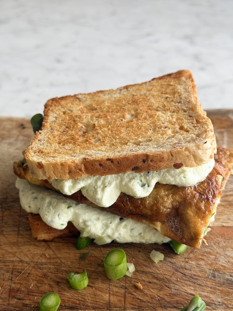 Kanapka tostowa z pastą twarogową i omletem ze szparagami