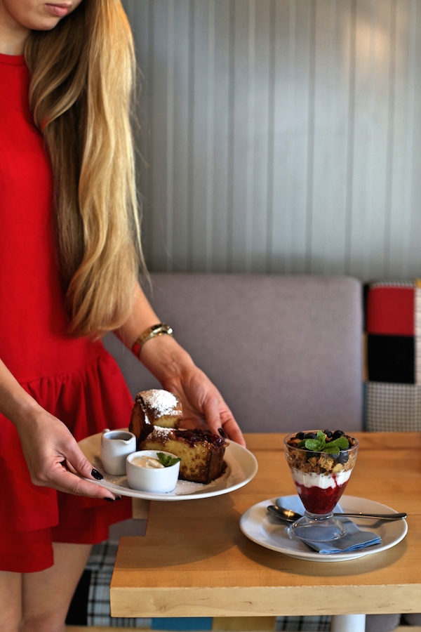 Pain perdu czyli francuskie tosty a w tym przypadku brioche wspaniale podane! Z ciepłym musem jagodowym, syropem klonowym i kwaśną śmietaną. Trochę żal kalorii, ale w sobotę trudno sobie odmówić. Poza tym w planie są biegi po gdyńskiej plaży.