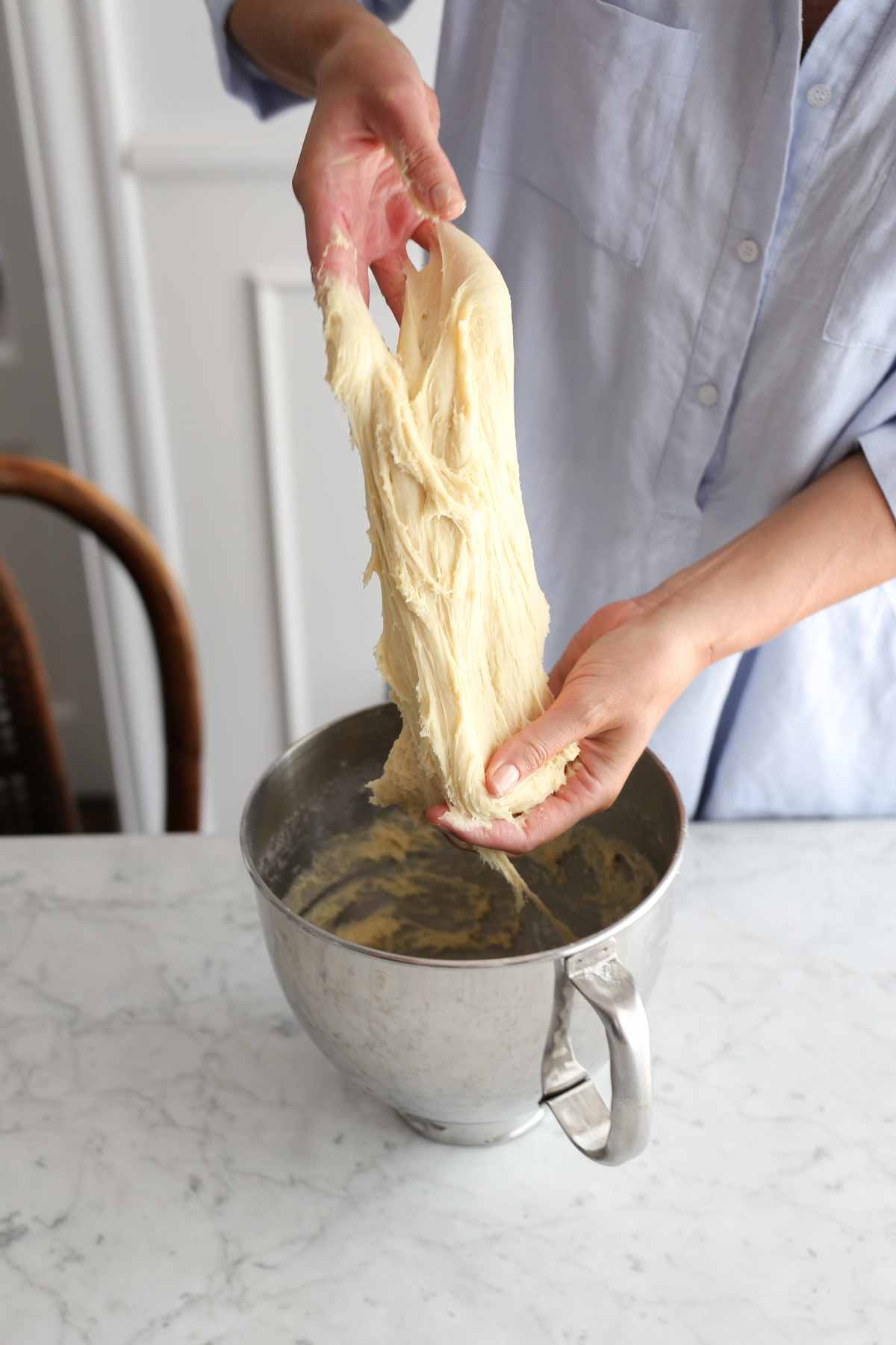Pozostałe mleko (powinno być letnie, ale nie gorące, bo ciasto nie urośnie) mieszamy z jajkiem, olejem, wanilią i cukrem. Dodajemy mąkę i zaczyn. Całość wyrabiamy ręcznie lub za pomocą miksera. Ciasto powinno być dość klejące.