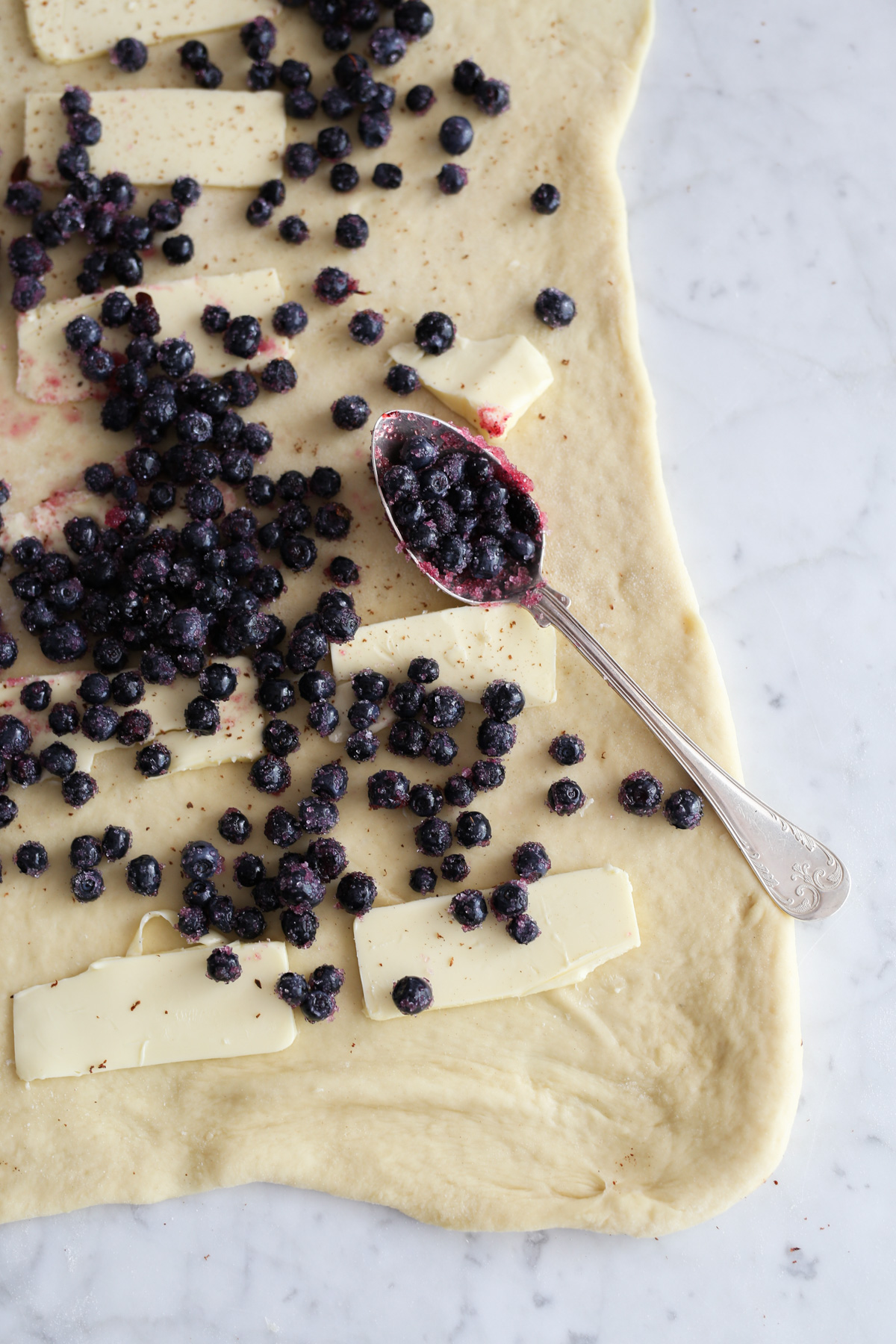 - Wyrośnięte ciasto drożdżowe ponownie zagniatamy i rozwałkowujemy na prostokąt (o wymiarach ok. 40 x 60 cm). Na powierzchni ciasta rozkładamy plastry schłodzonego masła oraz jagody wymieszane z cukrem. Zaczynając od jednego boku zawijamy ciasto w rulon (patrz na zdjęciu). Zwinięty rulon kroimy na plastry ok. 2,5 cm i przekładamy na blachę wyłożoną papierem do pieczenia. Pieczemy w rozgrzanym piekarniku w 180 stopniach C przez 20 minut. Gdy rollsy ostygną polewamy je polewą.