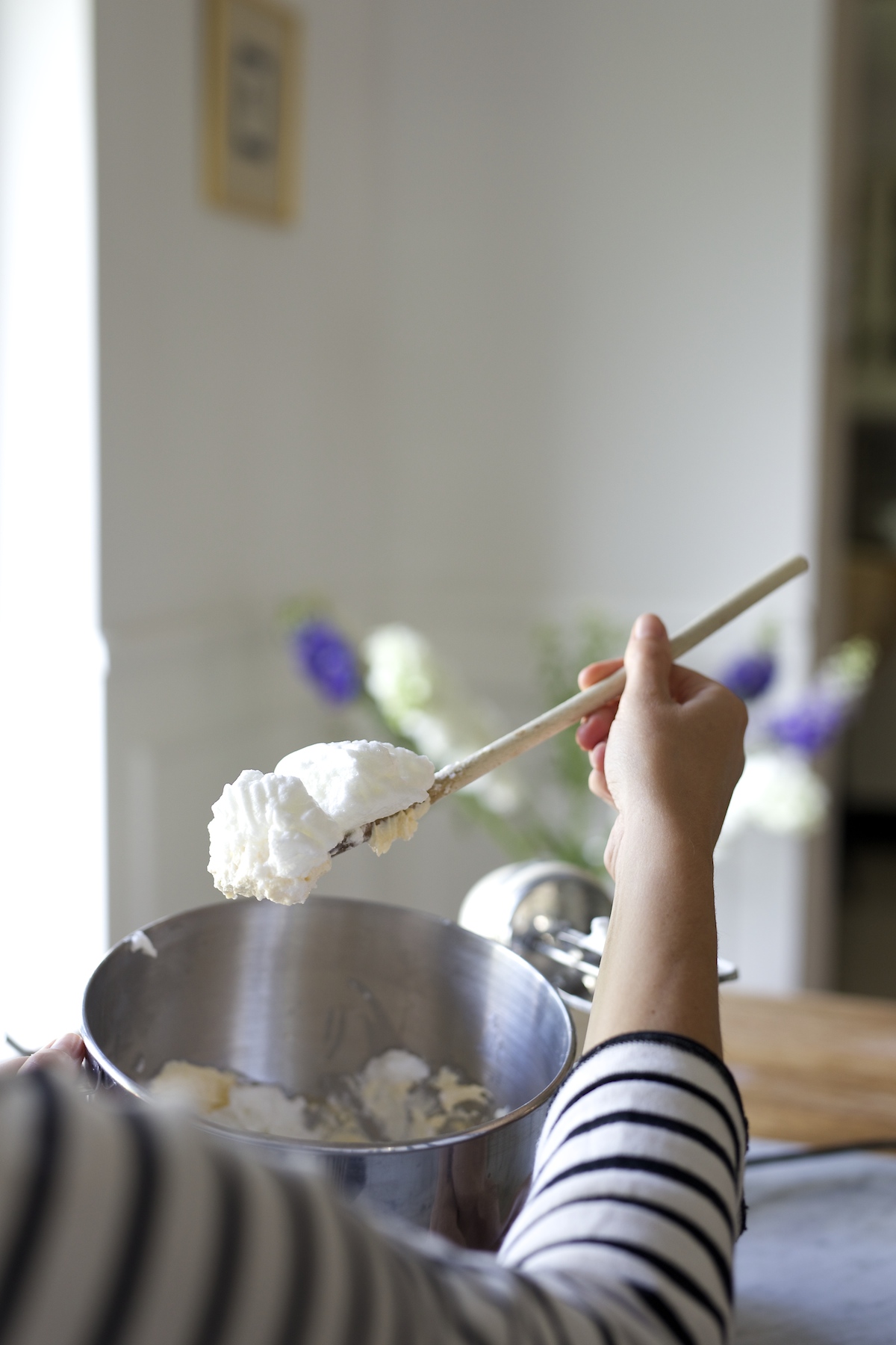 - Ser ucieramy z żółtkami i cukrem na gładką masę. Dodajemy przesianą mąkę oraz ubitą na sztywno pianę z białek. Dokładnie mieszamy. Ostatecznie masa jest dość rzadka – jeżeli będziemy mieli trudności w formowaniu kluseczek, to dodajmy mąkę ziemniaczaną.