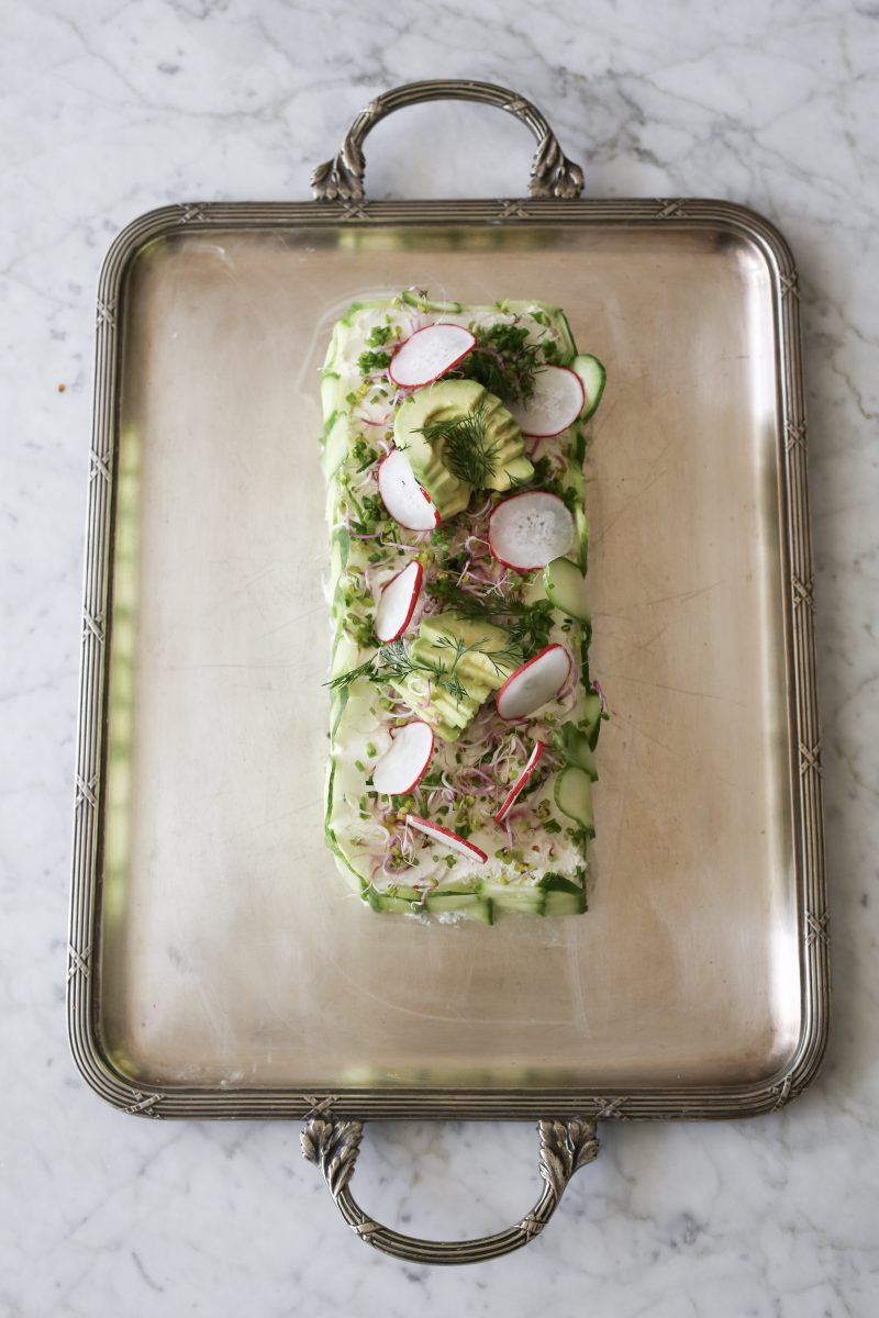 - Na koniec dekorujemy – wokół układamy cienkie plastry świeżego ogórka, dodajemy plastry rzodkiewki, kiełki rzodkiewki, szczypior i kilka plastrów awokado. Całość możemy delikatnie skropić sokiem z cytryny, żeby wszystko było jeszcze świeższe i bardziej aromatyczne. Na samym wierzchu możemy rozłożyć połówki jajek, ugotowanych na twardo. Najlepiej smakuje dobrze schłodzona, kiedy wszystkie smaki pięknie się połączą.