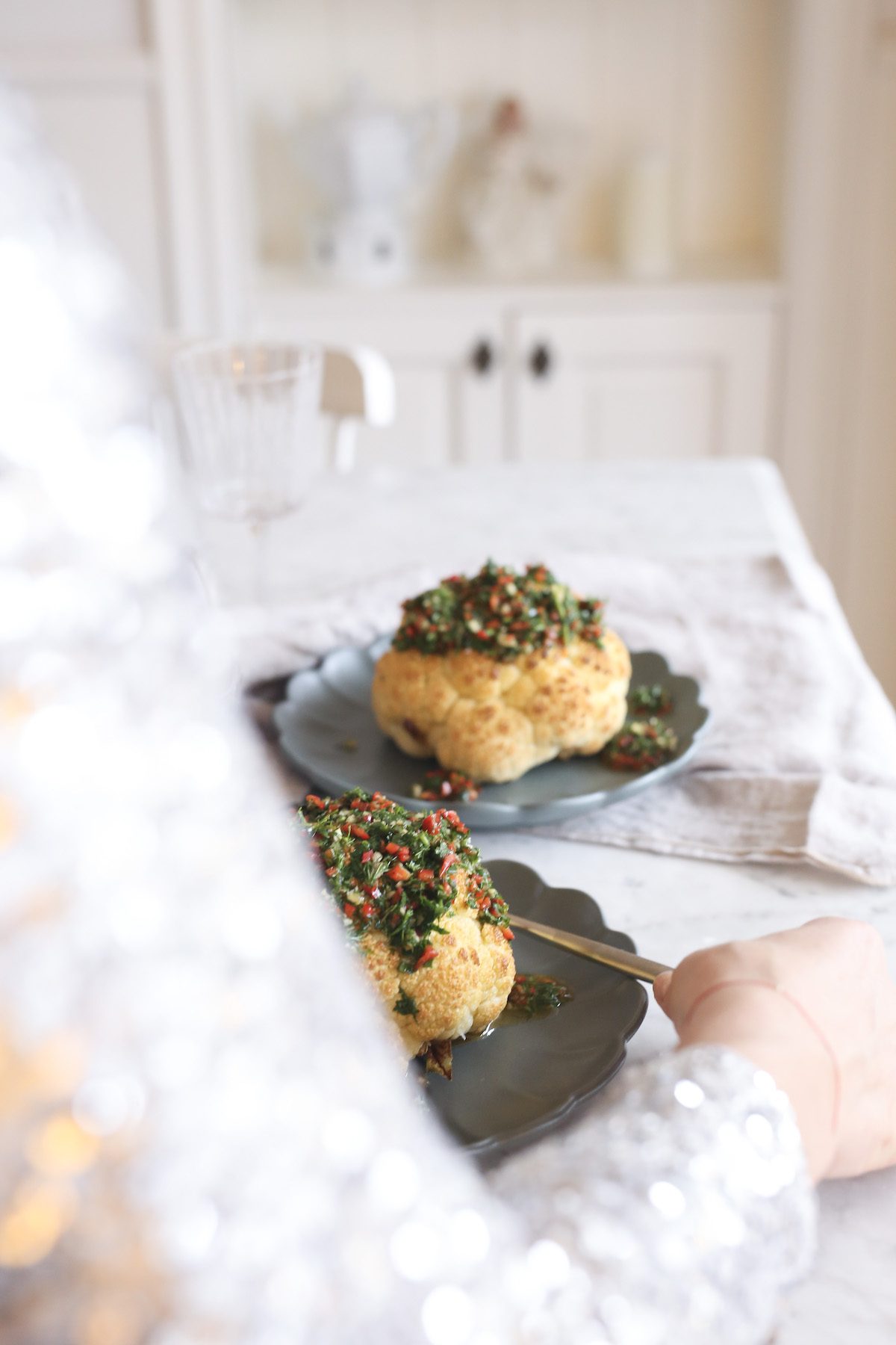 - Kalafior dokładnie myjemy i pieczemy w rozgrzanym piekarniku w 180 stopniach C do momentu aż się zarumieni (ok. 12-15 min). Drobno posiekane zioła i czosnek łączymy z oliwą, płatkami chili i solą morską. Następnie polewamy upieczonego kalafiora.