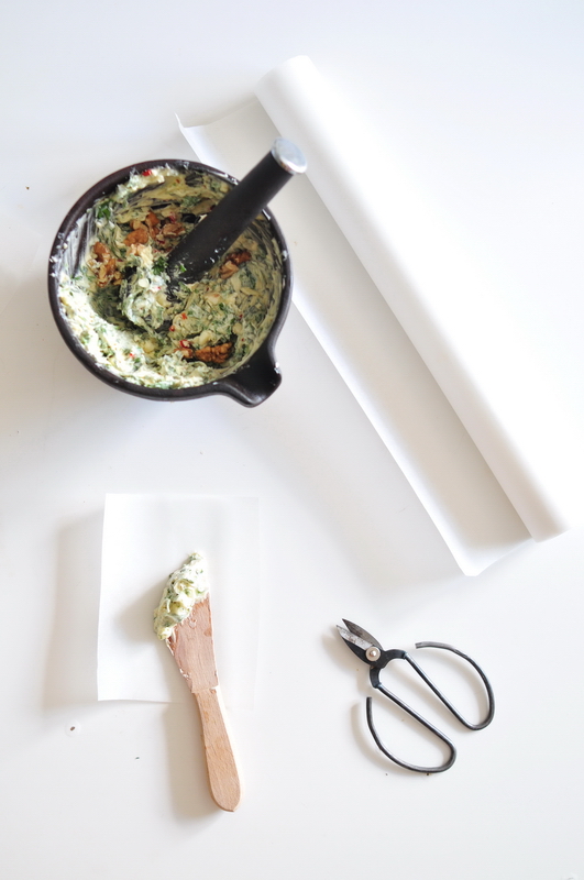 1. Orzechy prażymy na rozgrzanej patelni. Kukurydzę dokładnie myjemy, umieszczamy w dużym garnku z wodą. Dodajemy szczyptę soli i cukier. Gotujemy, aż sami uznamy że jest dobra (osobiście lubię niedogotowaną). Masło ucieramy w moździerzu z rozgniecionym czosnkiem, posiekaną papryczką, ziołami i prażonymi orzechami włoskimi. Doprawiamy solą. Gotowe masło czosnkowe przekładamy na przygotowane kawałki papieru do pieczenia. Zawijamy w rulon i wkładamy do zamrażalnika.