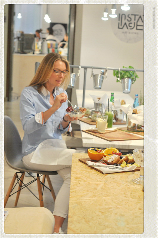 Do Instalacji trafiłyśmy oczywiście przypadkiem, w drodze z sesji zdjęciowej z Parku Łazienkowskiego. Głodne i przemoczone (tego dnia lało jak z cebra i nici ze zdjęć) marzyłyśmy o ciepłym śniadanku. Z tego co pamiętałam, oprócz Quchni Artystycznej i Atelier Modesta Amaro żadnego miejsca na szybką kawę i dobrą jajecznicę w okolicy nie było. Nie spodziewałam się jednak, że w Zamku Ujazdowskim można właśnie to wszystko odnaleźć. Atmosfera młodzieżowa. Stale ktoś wchodzi i wychodzi. Pan z rasowym psem i pani z rulonami architektonicznymi. Nawet ktoś tego dnia obchodził urodziny i trafił mu się kawał czekoladowego brownie ze świeczką. Pogoda raczej nie zamierzała się zmieniać w przeciągu najbliższych godzin, a zatem śniadanie przedłużyłyśmy do lunchu. Była owocowa granola, wiejski twarożek z rzeżuchą i szczypiorem, coś zielonego do picia- podobno zdrowe. Naturalnie nie zabrakło francuskich tostów i kawałka drożdżowego ciastka z borówkami. Zadomowiłyśmy się i nikomu nie chciało się wychodzić. Podobno jednak miałyśmy pecha, bo Instalacje Art Bistro królują na co dzień na trawie pod zmyślnie zaprojektowanymi instalacjami. Zatem czekam na kolejny raz, oby tym razem pogoda dopisała!